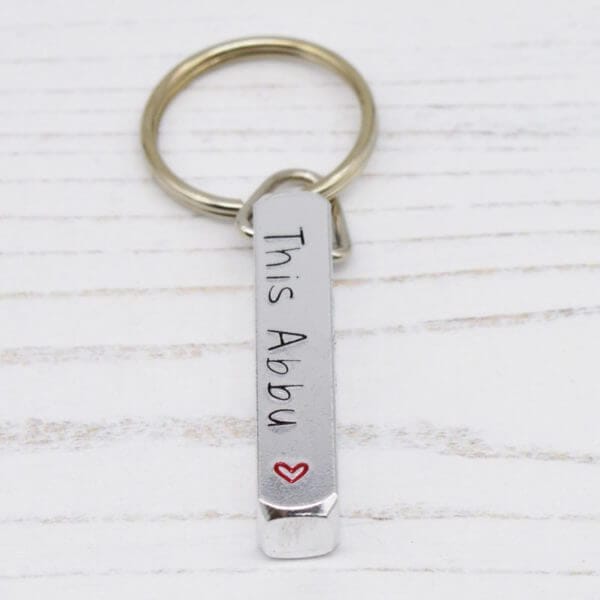 A perfect personalised gift idea for this Father’s Day (or other occasions) our chunky ‘Abbu Belongs To’ chunky bar keyring has four sides that can all be personalised!