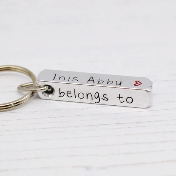 Tell them who your Daddy belongs to with our personalised ‘Abbu Belongs To’ bar keyring!