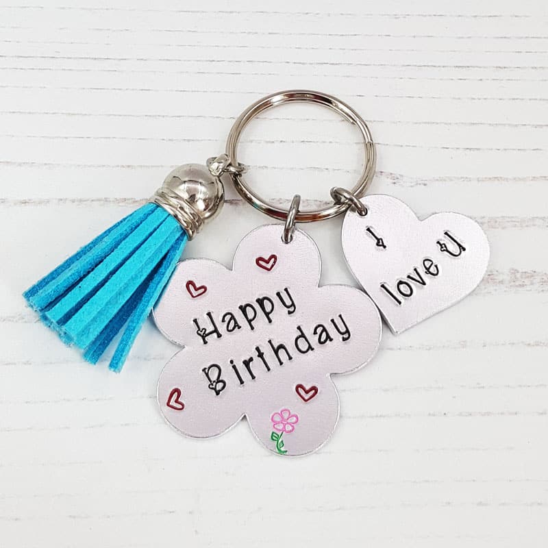 This lovely birthday gift idea is hand stamped using our Hello Sweetheart font. On the flower, measuring approximately 40mm is stamped ‘Happy Birthday’ with an additional 22mm heart shape blank stamped with ‘I love you’. Both are made from aluminium and to complete the look, we have added a faux suede tassel with the colour chosen at random.