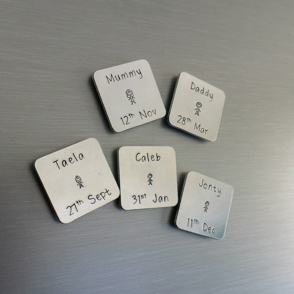 Introducing our delightful Birthday Magnets, the perfect blend of personalisation and functionality! Crafted with care from high-quality aluminium, each magnet measures 30mm x 30mm, providing ample space for a name, birth date, and one of our adorable stick people designs.