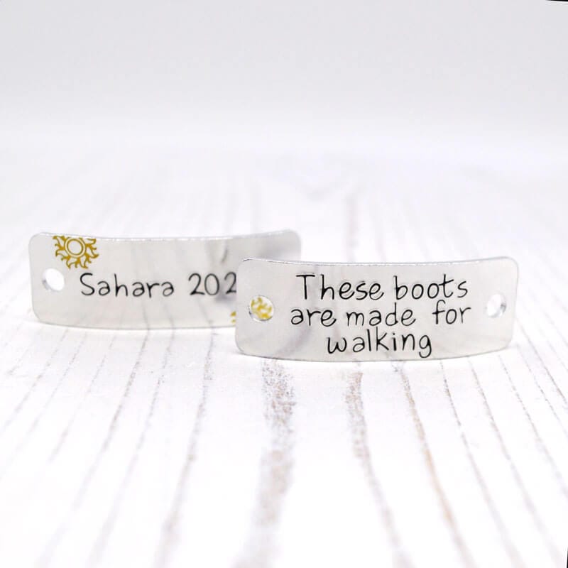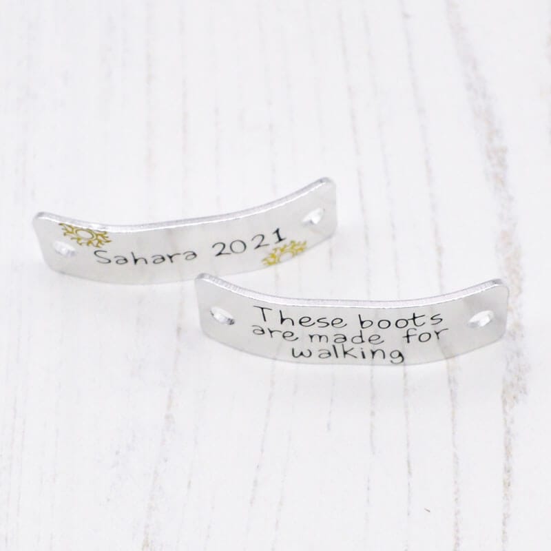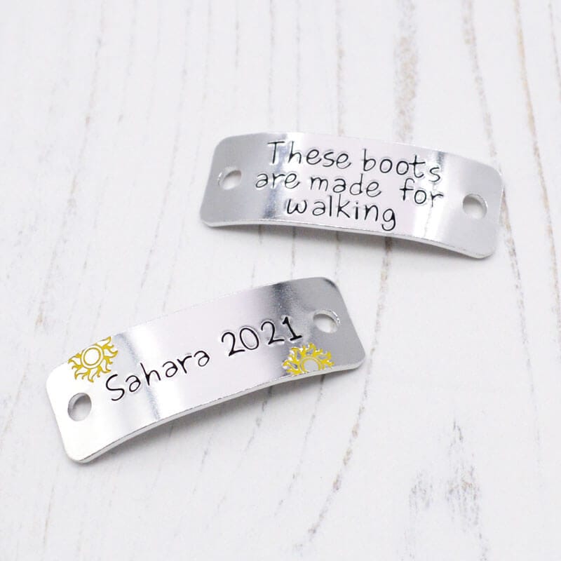 Hand-stamped on lightweight, durable aluminium, these trainer tags measure approximately 45mm x 15mm and are slightly curved for a comfy fit. They’re perfect for muddy trails, urban streets, or anywhere their shoes take them – aluminium won’t rust and cleans up in a snap!