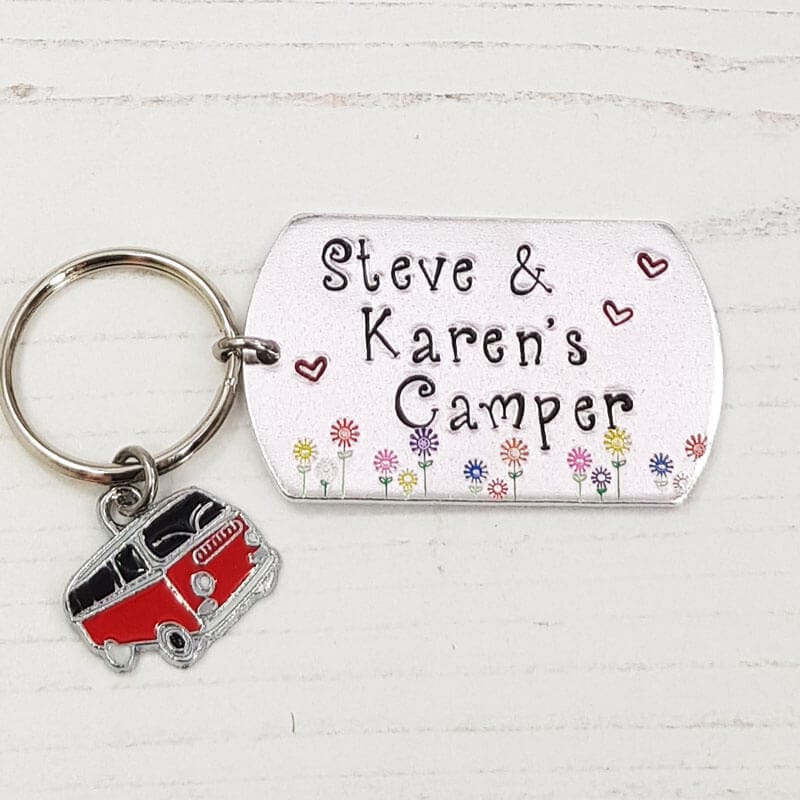 Just let us know in the box above what name you want on the campervan keyring and we’ll create you a beautiful and unique present.  It is hand stamped using our Quirky Girl font and completed with our lovely flowers which we individually colour so no two keryings are the same.  We finish it with a super cute red campervan enamel charm.