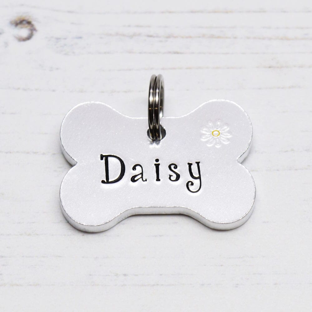 Imagine your loyal canine companion sporting this uniquely hand-stamped tag, adorned with a charmingly coloured daisy flower. 🌼 And guess what? The creative reins are in your hands! Personalise the front with your dog’s name or even your own surname – talk about a bespoke pet accessory!