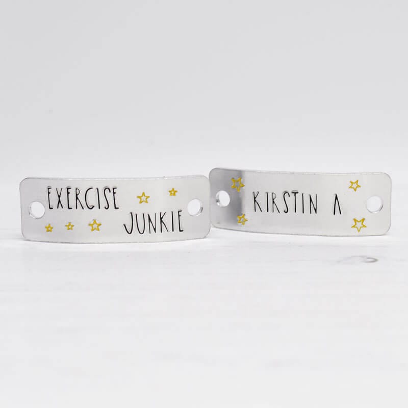 Made from aluminium, our trainer tags measure approximately 45mm x 15mm and we carefully hand-stamp the text using our ‘Gingerbread’ font.