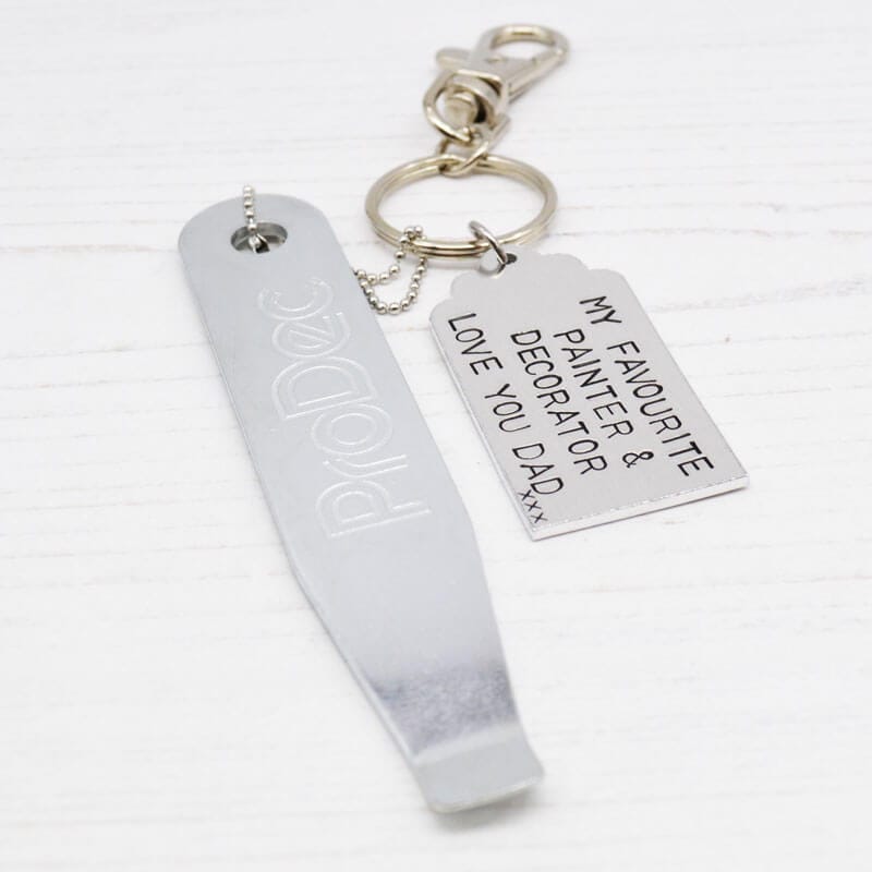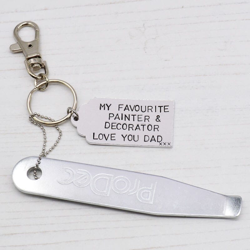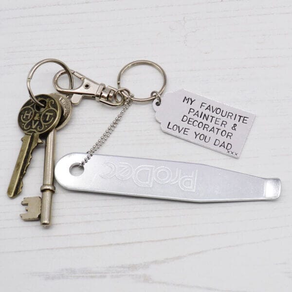 This keyring includes a ProDec paint can opener and a luggage tag style blank that we hand stamp “My favourite painter & decorator Love you Dad xx”
