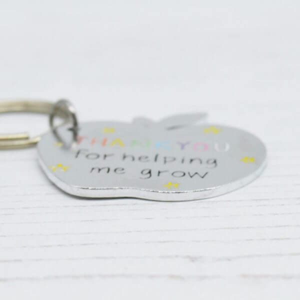 Using an apple-shaped aluminium blank, our ‘Helping Me Grow’ apple keyring measures approximately 40mm x 40mm. We have hand stamped it using our Piece by Piece font and coloured ‘THANK YOU’ with rainbow colours.