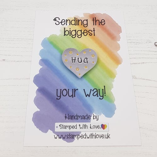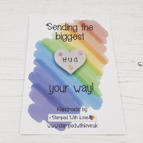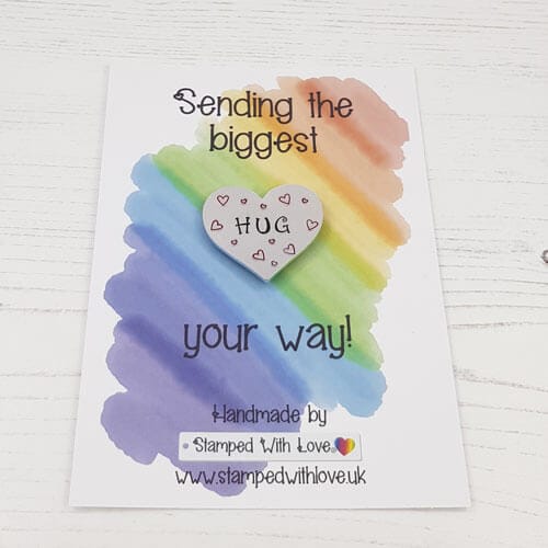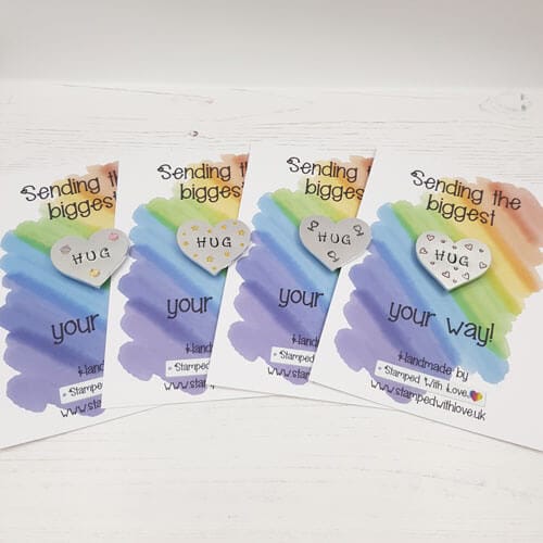 The HUG magnets are made with a 34mm hearts are our thicker aluminium blanks that we then attach to a super strong magnet. We mount it onto a lovely card so we can send it straight to you or your friend / loved one as a lovely hug in the post.