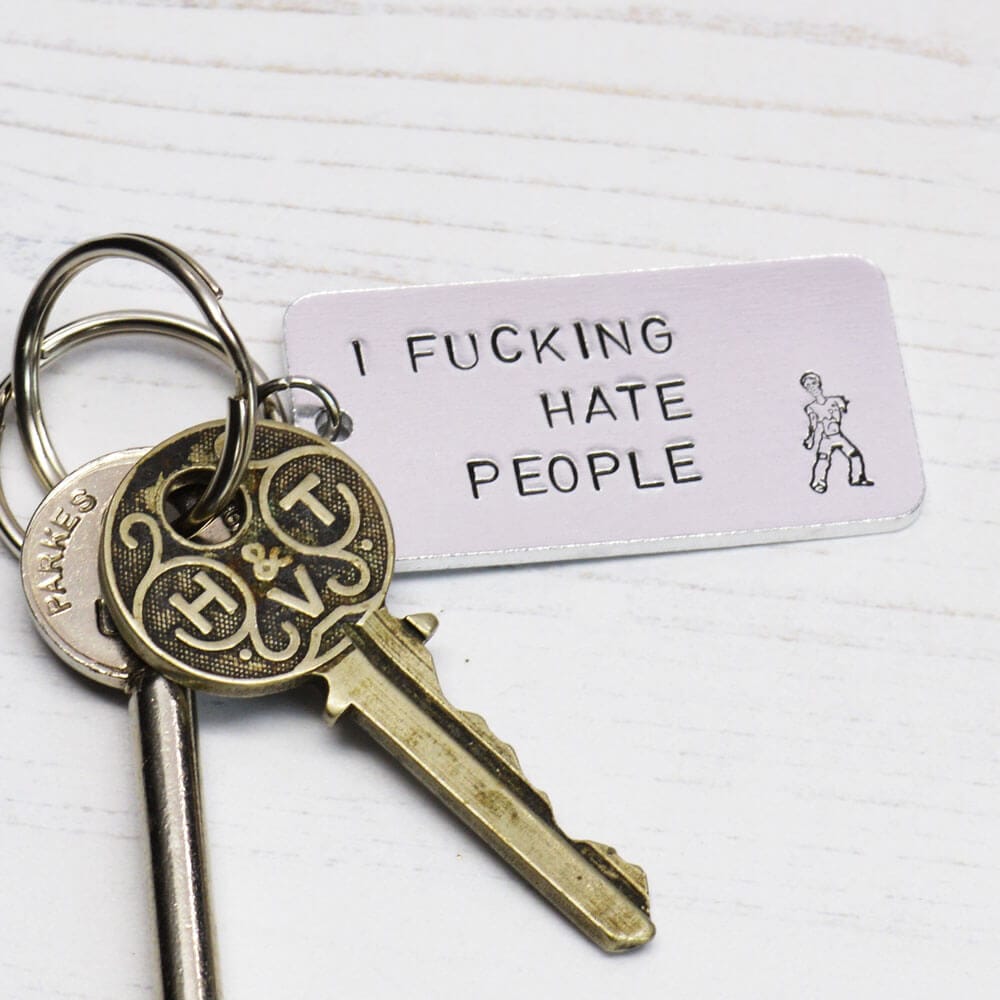 Do you find solace in your own company, revelling in the peaceful tranquillity of your inner world? Are social gatherings not your cup of tea, and would you rather be curled up with a good book or lost in your thoughts than surrounded by a crowd of people? If so, we have the perfect keyring that speaks your truth – our “I Fucking Hate People” hand-stamped aluminium keyring!