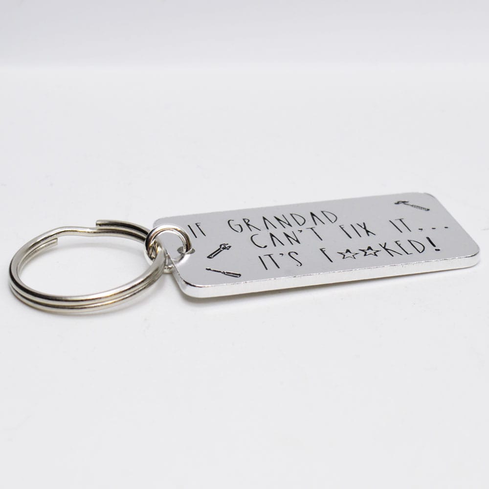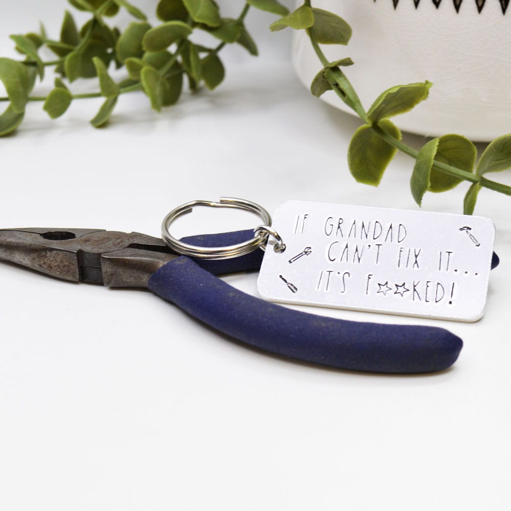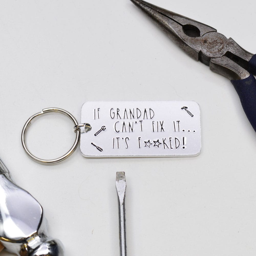 Get ready to bring some laughter to your grandad’s keychain with this cheeky aluminium keyring! Measuring 50mm x 25mm, it’s hand-stamped with the classic saying, “If Grandad can’t fix it… it’s f***ed,”—because let’s face it, when grandad can’t fix something, it’s really beyond repair. For that added touch, we’ve stamped some tools for extra flair.