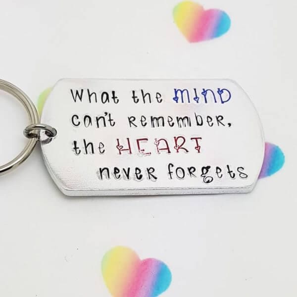 A boost of encouragement for loved ones suffering from Alzheimer’s or Dementia, or even if their memory isn’t the best, our ‘Mind Can’t Remember’ keyring will remind them of their capability of love.