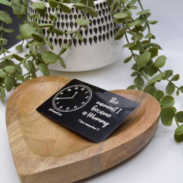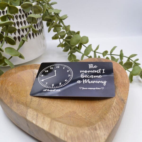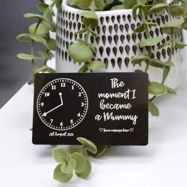 Introducing the “Moment I Became a Mummy” Black Metal Wallet Card—a sleek and sentimental keepsake that celebrates one of life’s most unforgettable moments. This ultra-thin card, made from durable black metal, is laser engraved with a clock showing the exact time of birth, the date underneath, and the touching phrase “The moment I became a Mummy” beside it. Beneath this special tribute, there’s space for an optional personalised message, allowing you to add a few heartfelt words to make it uniquely hers.