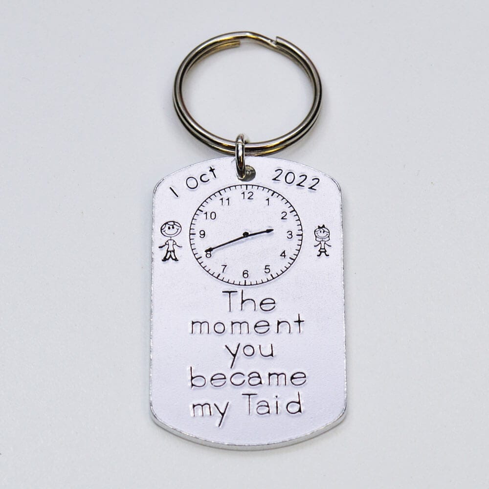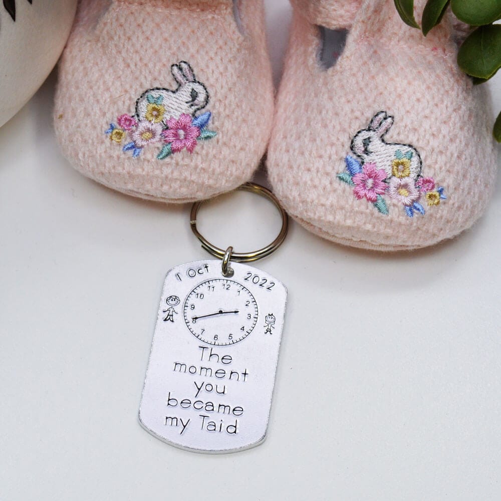 This beautiful keyring features a hand-stamped clock at the top, showcasing the time of the baby’s birth. Beneath the clock, we carefully stamp the heartfelt phrase ‘The moment you became my Taid’ using our playful Jelly Bean font. On the left side of the clock, our unique Daddy stick figure adds a touch of charm, while on the right, you can choose from a girl, boy, or baby stamp—these are optional, allowing you to customise it to your heart’s content. Above the clock, the baby’s date of birth is elegantly inscribed, making this a truly special keepsake.