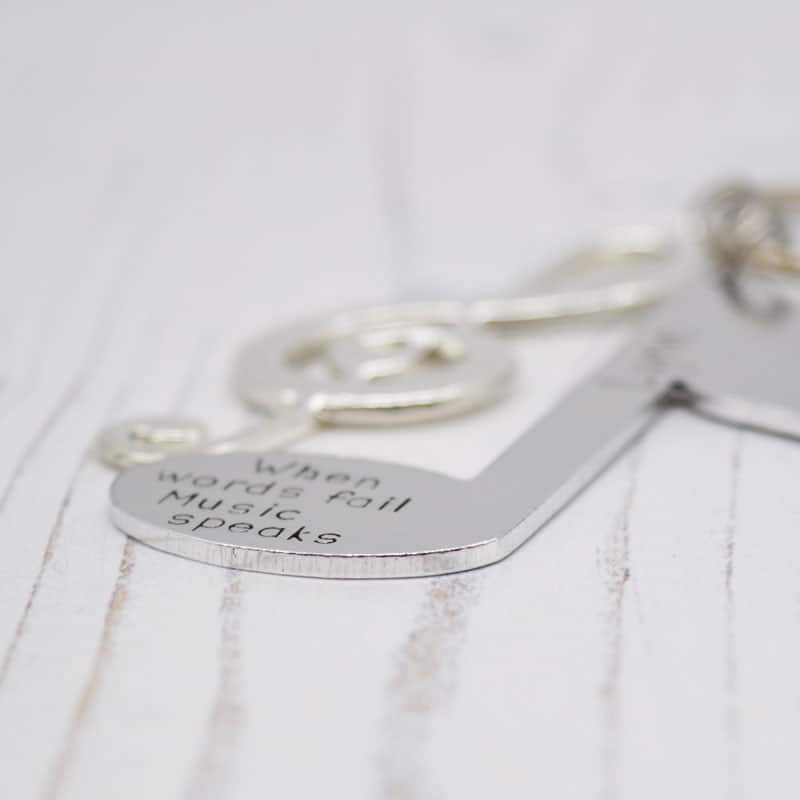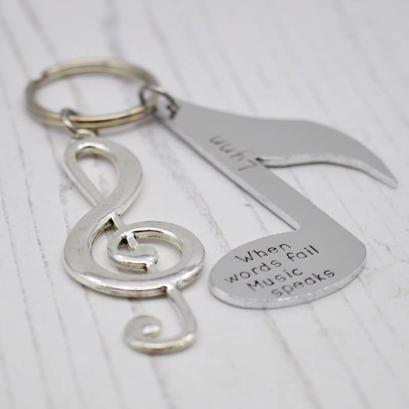 Our Musical Note keyring is made from an aluminium music note that measures 60mm long. To that we have added a gorgeous 61mm treble clef charm. The note head is stamped with ‘When words fail Music speaks’. There is space on the notes stem for a name.