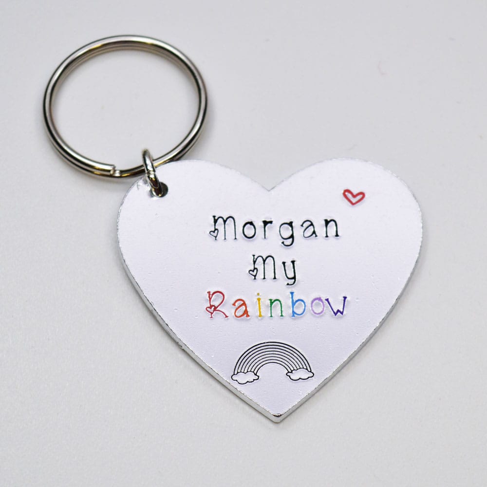 Celebrate the arrival of a precious rainbow baby with our beautifully hand-stamped heart-shaped keyring, measuring 46mm across and crafted from lightweight aluminium. This heartfelt piece serves as a touching tribute to new beginnings after loss, making it a perfect keepsake for new parents.