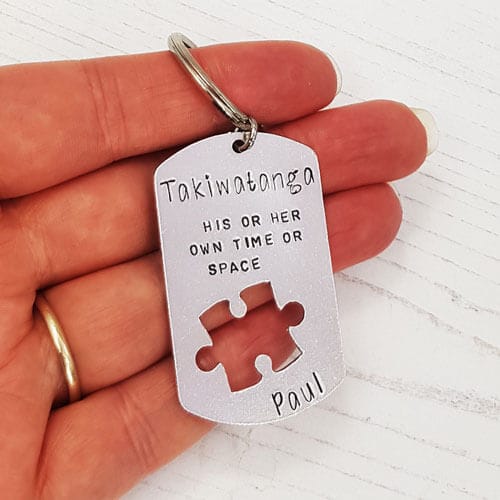 This lovely keyring has a jigsaw cut out, the traditional symbol for Autism recognised the world over and is hand stamped with ‘Takiwatanga’ using our Piece by Piece. Below this is the meaning ‘His or Her own time and space’ in our mini font.