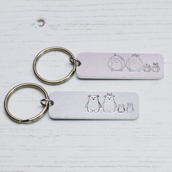 The design is completely tailored to represent your family. Choose either penguins or bears, and we’ll stamp each family member’s character onto the keyring. Mums and daughters are adorned with sweet bows, while dads and sons complete the gang with their own charming details. Simply let us know in the box above which family team you’d like—Team Penguin or Team Bear—and the members you’d like included: Dad, Mum, Boy, or Girl.