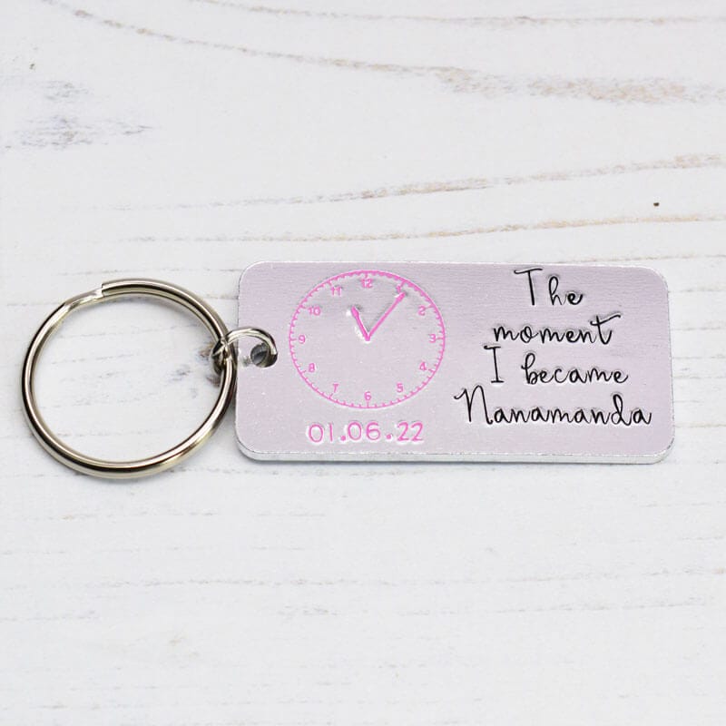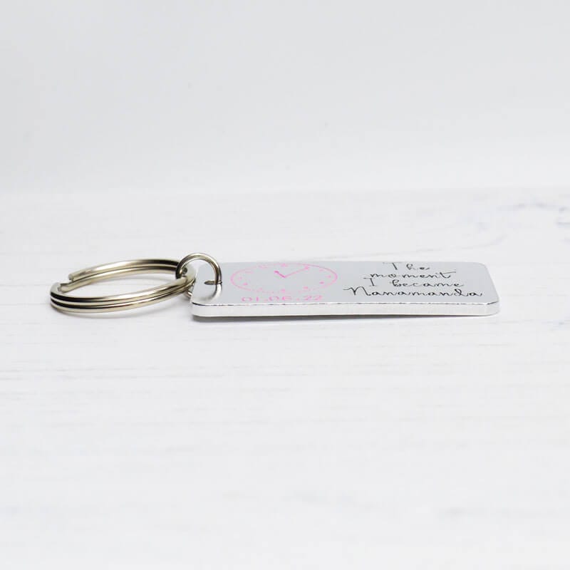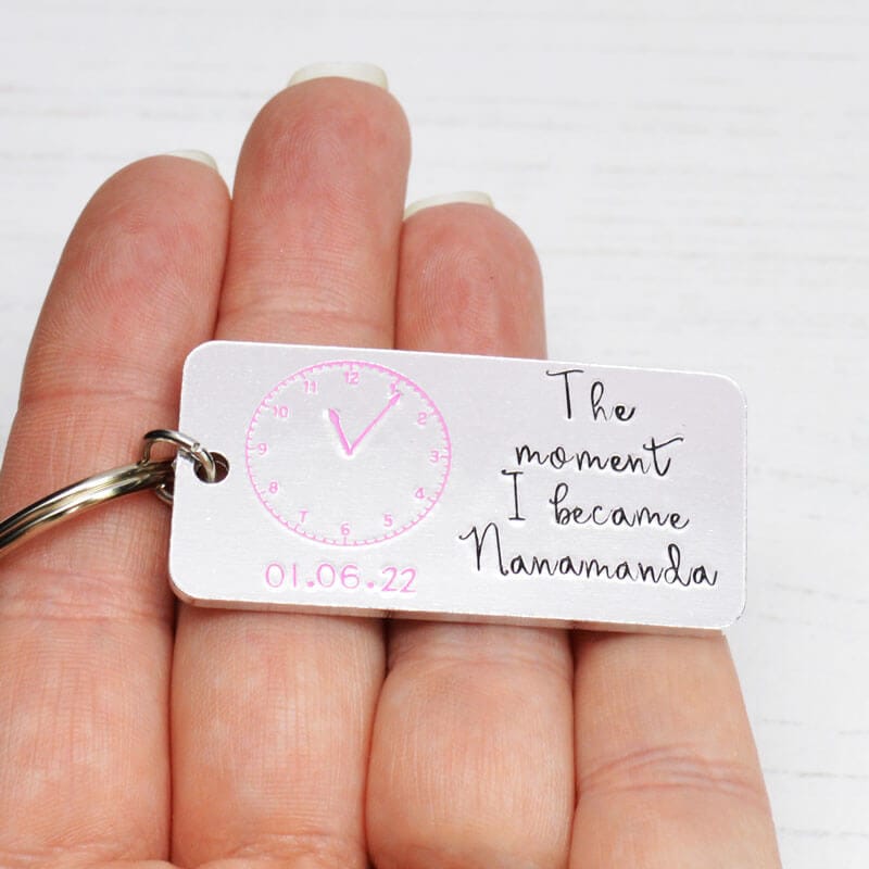 This keyring is hand stamped with the text ‘The moment I became [name]’ using our beautiful Sweet Peony font. It is then personalised with a lovely clock to mark the time of the birth and the date below it.