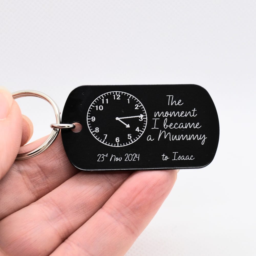 Each dog tag is laser engraved with either “The moment I became a Daddy” or “The moment I became a Mummy”, complete with a charming engraved clock showing the precise time of birth and the date engraved below. Beneath the wording, each tag can be personalised with baby’s name, creating a perfectly paired set that tells their shared story.