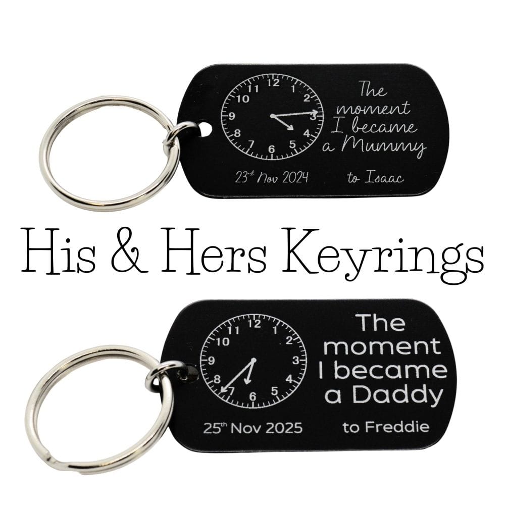 Two matching keepsakes. One unforgettable moment. This His & Hers set of black anodised aluminium dog tag keyrings celebrates the exact second they became Mum and Dad — a milestone that changed everything.
