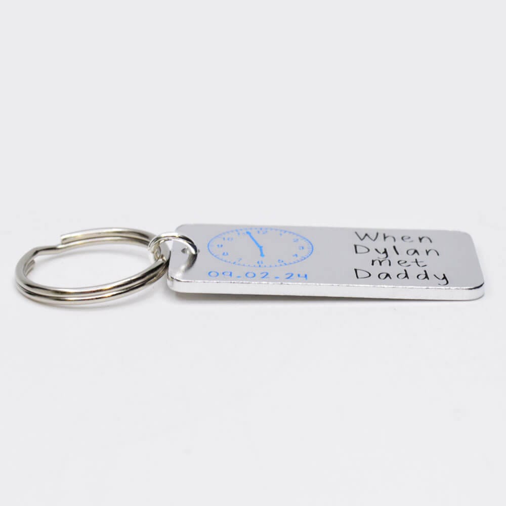 Made from lightweight, durable aluminium and measuring 50mm x 25mm, this keyring is carefully hand-stamped to create a one-of-a-kind piece that captures the special bond between father and child. The elegant script adds a warm, personal touch to the design, while a small clock marks the exact time your child entered the world, bringing a smile to your face each time you glance at it.