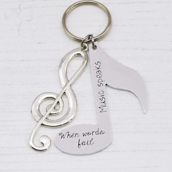 Our Musical Note keyring is made from aluminium and measures approximately 60mm long. To that we have added a gorgeous 61mm treble clef charm. The note head is stamped with ‘When words fail Music speaks’ using a mixture of our Only Human and Love Somebody fonts.